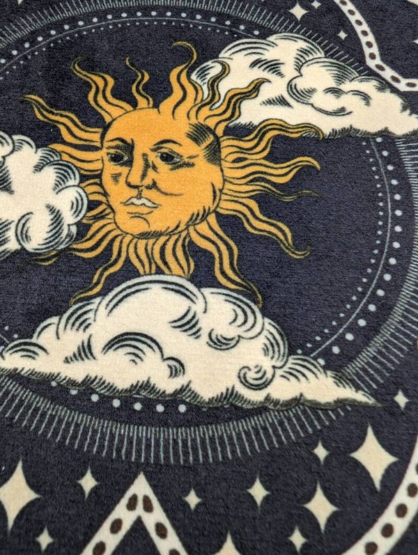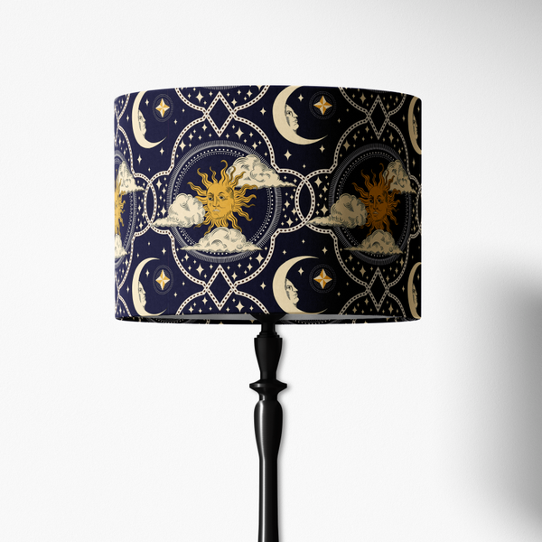 Turn up the magic of the sun and moon, and let this exquisite table lampshade become the star of your interior design! The centerpiece of the shade is the stunning celestial print, featuring intricately engraved sun, moon, and star motifs. These medieval symbols, beautifully detailed and set against the plush velvet background, bring a sense of cosmic wonder and timeless magic to your space. The sun and moon, representing balance and harmony, infuse your home with a mystical energy. And if you are not into magic and symbolism... well, it will still look stunning on a nightstand!